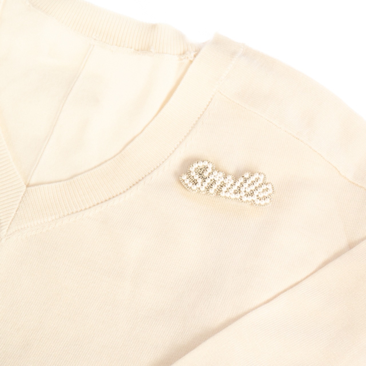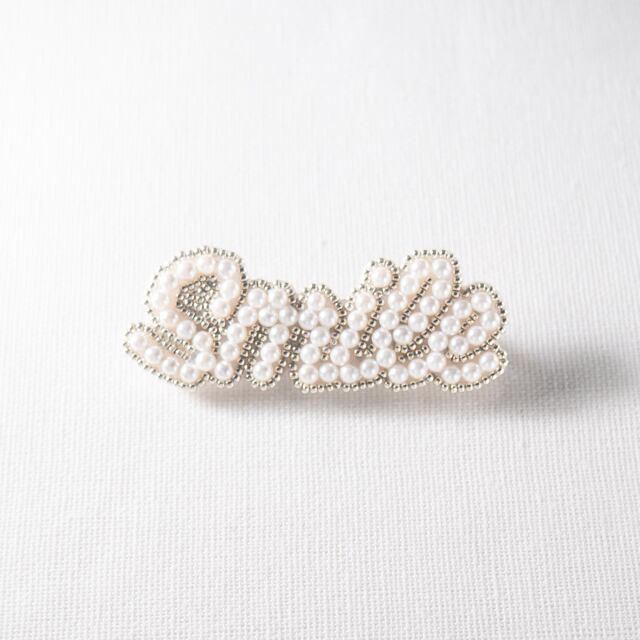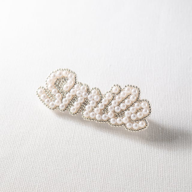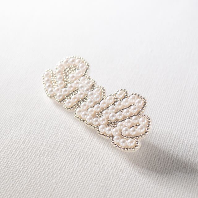 貝パールとビーズを一粒ずつ丁寧に縫い付け、立体感のある文字に仕上げました。